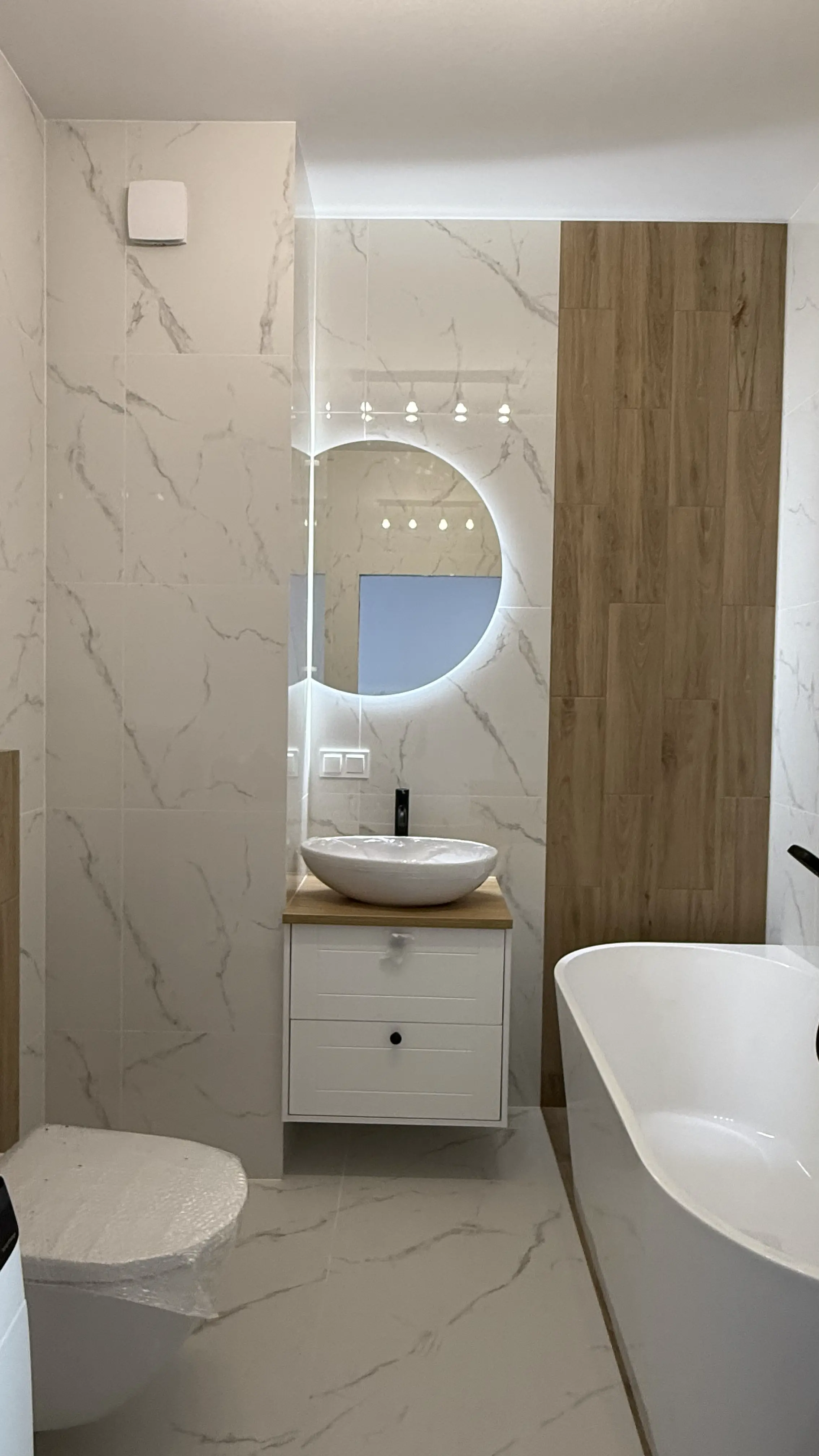 Projekt obejmował wykonanie łazienki w standardzie pod klucz wraz z dodatkowymi pracami adaptacyjnymi w mieszkaniu.