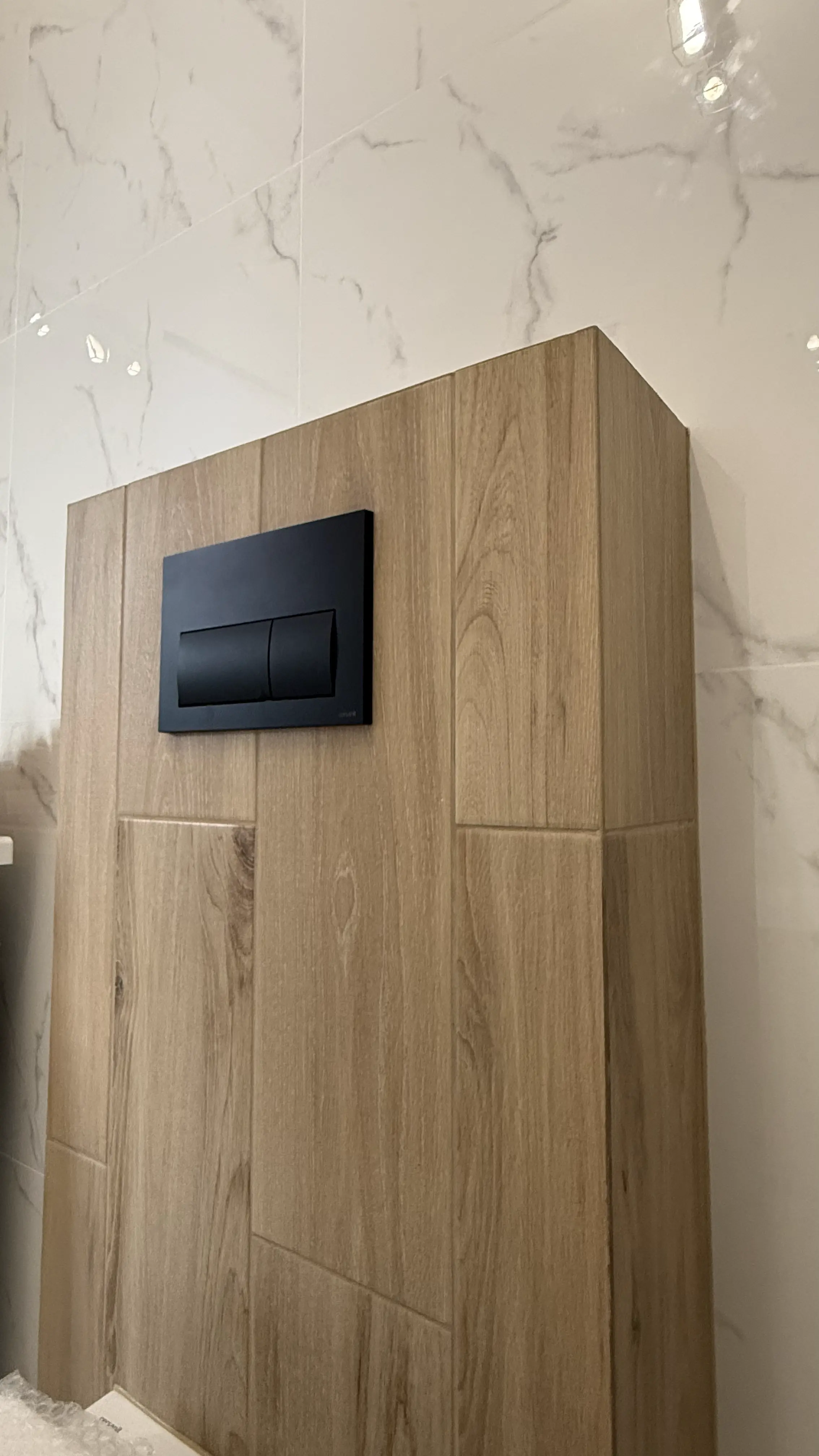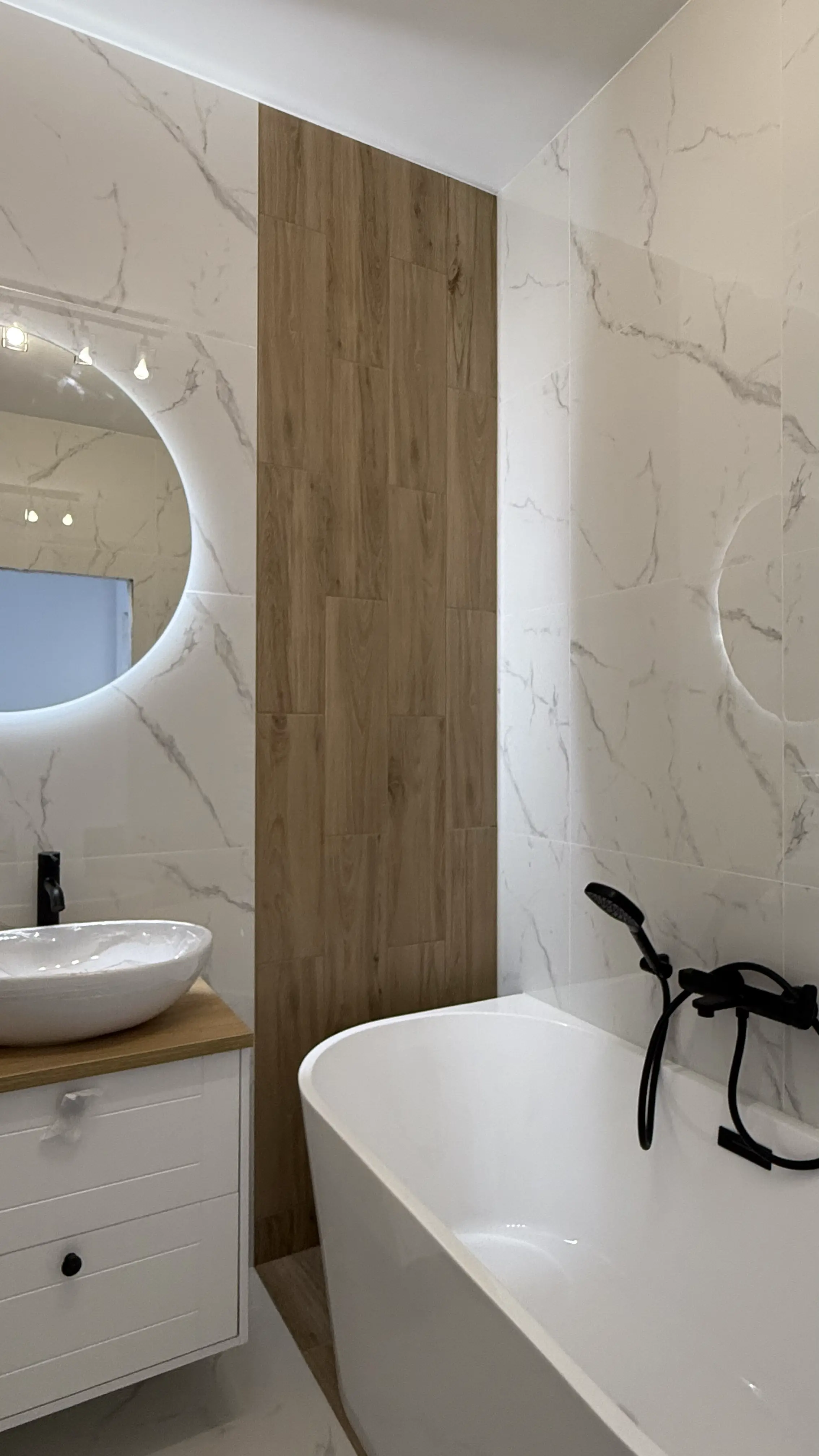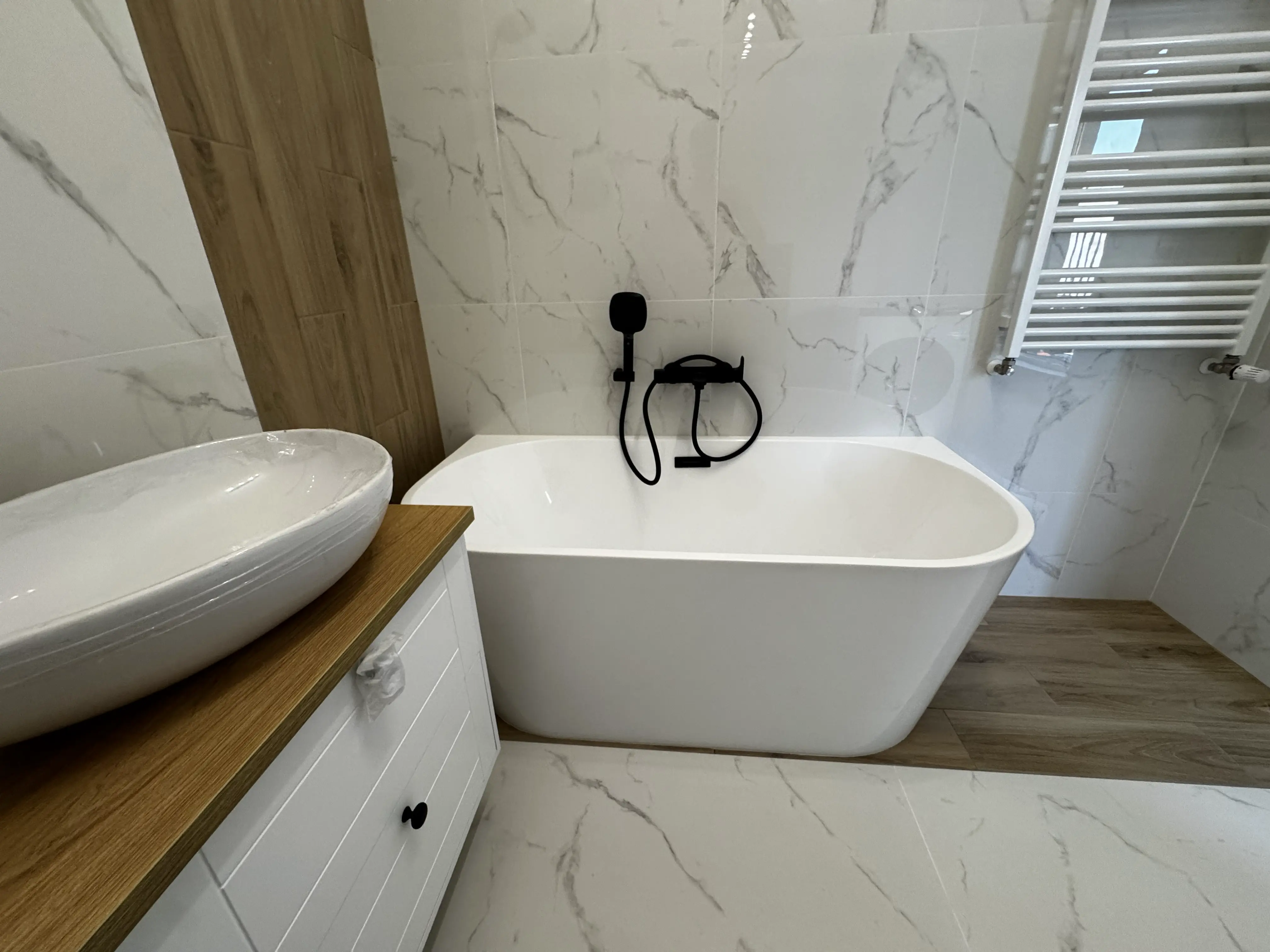 Łazienka została wykonana kompleksowo – od przygotowania podłoża i izolacji przeciwwilgociowej, przez układanie płytek, po montaż elementów wyposażenia. Szczególną uwagę zwrócono na precyzję układania płytek podłogowych oraz zachowanie odpowiednich spadków i osi.