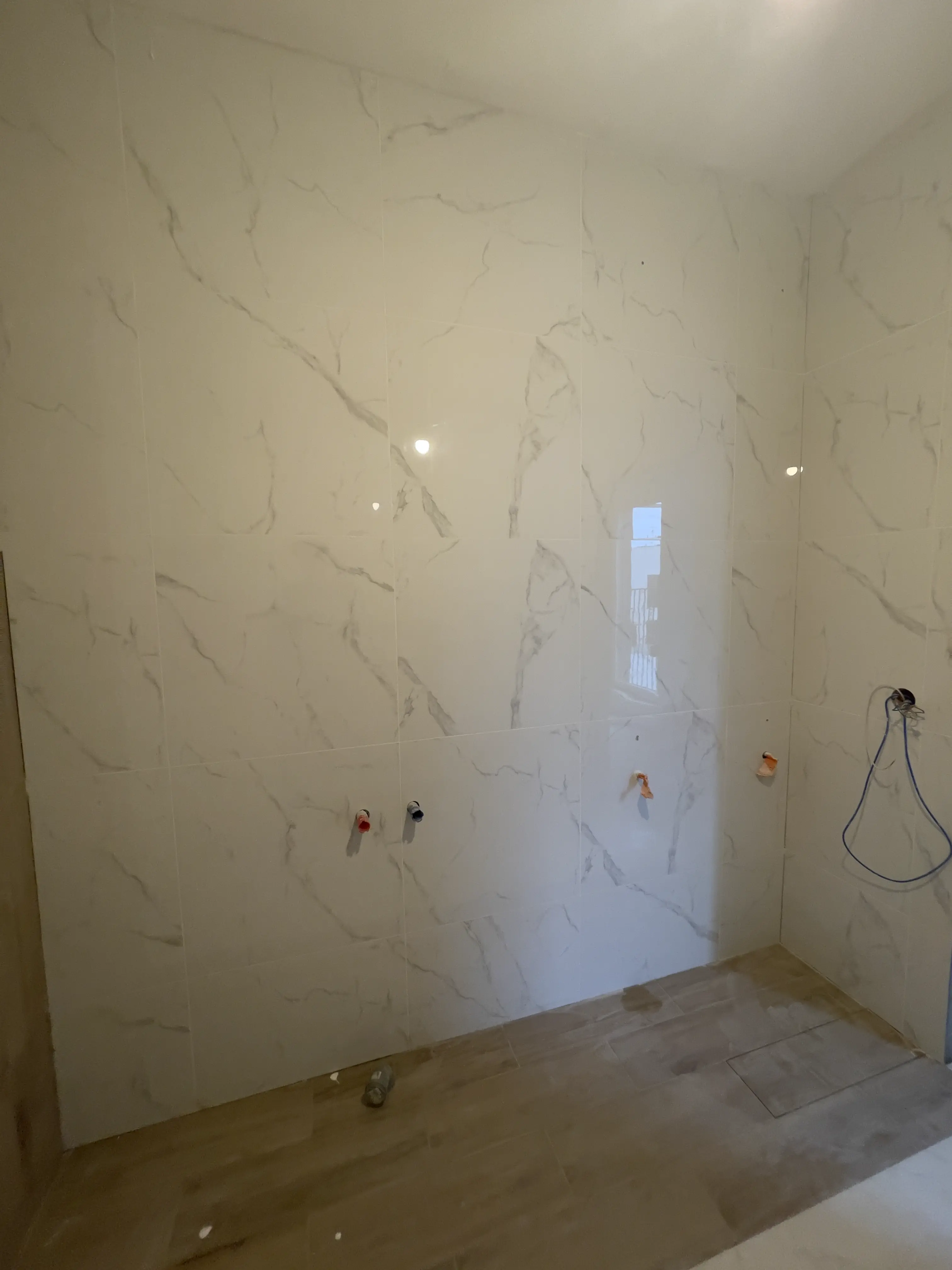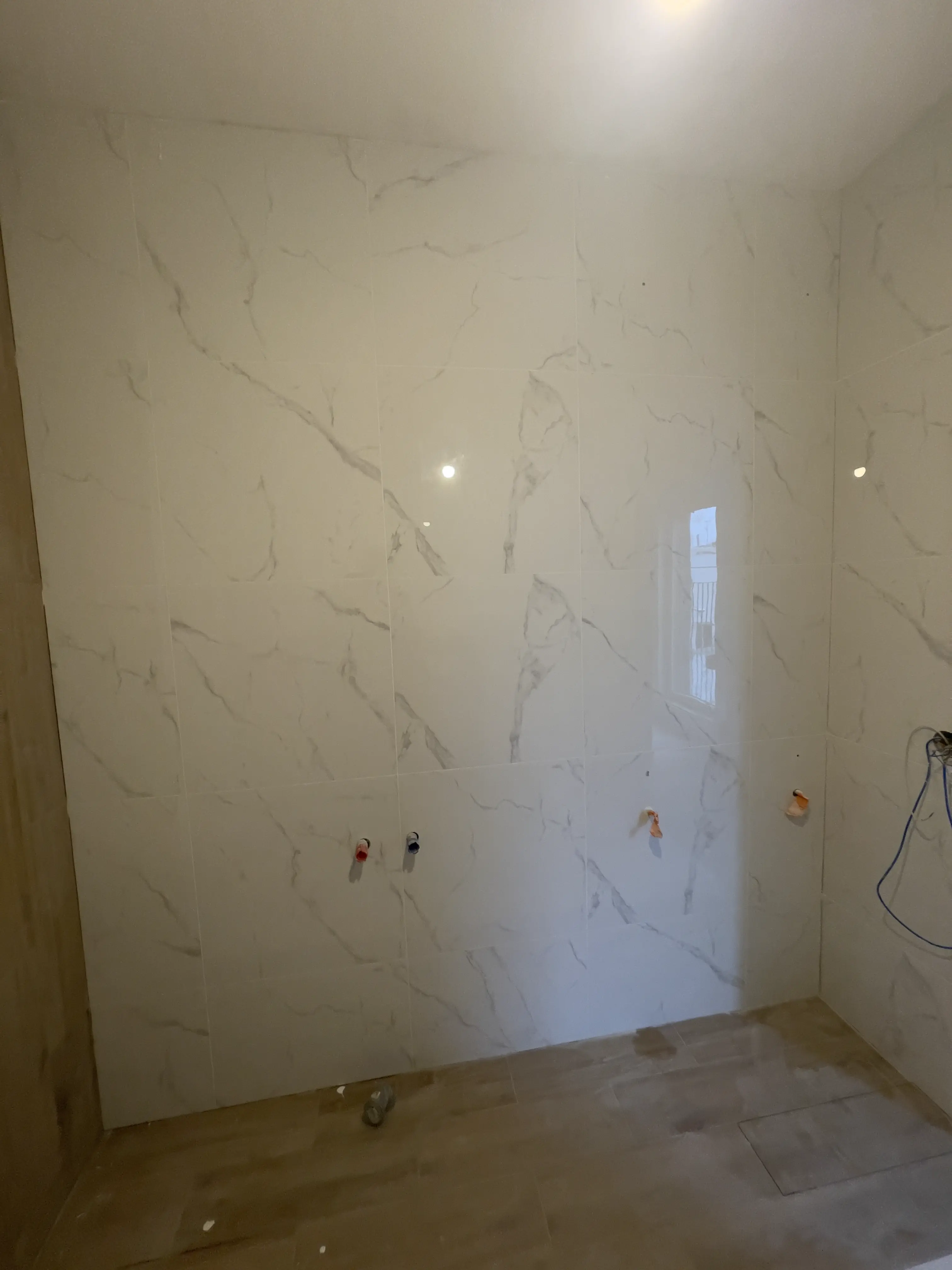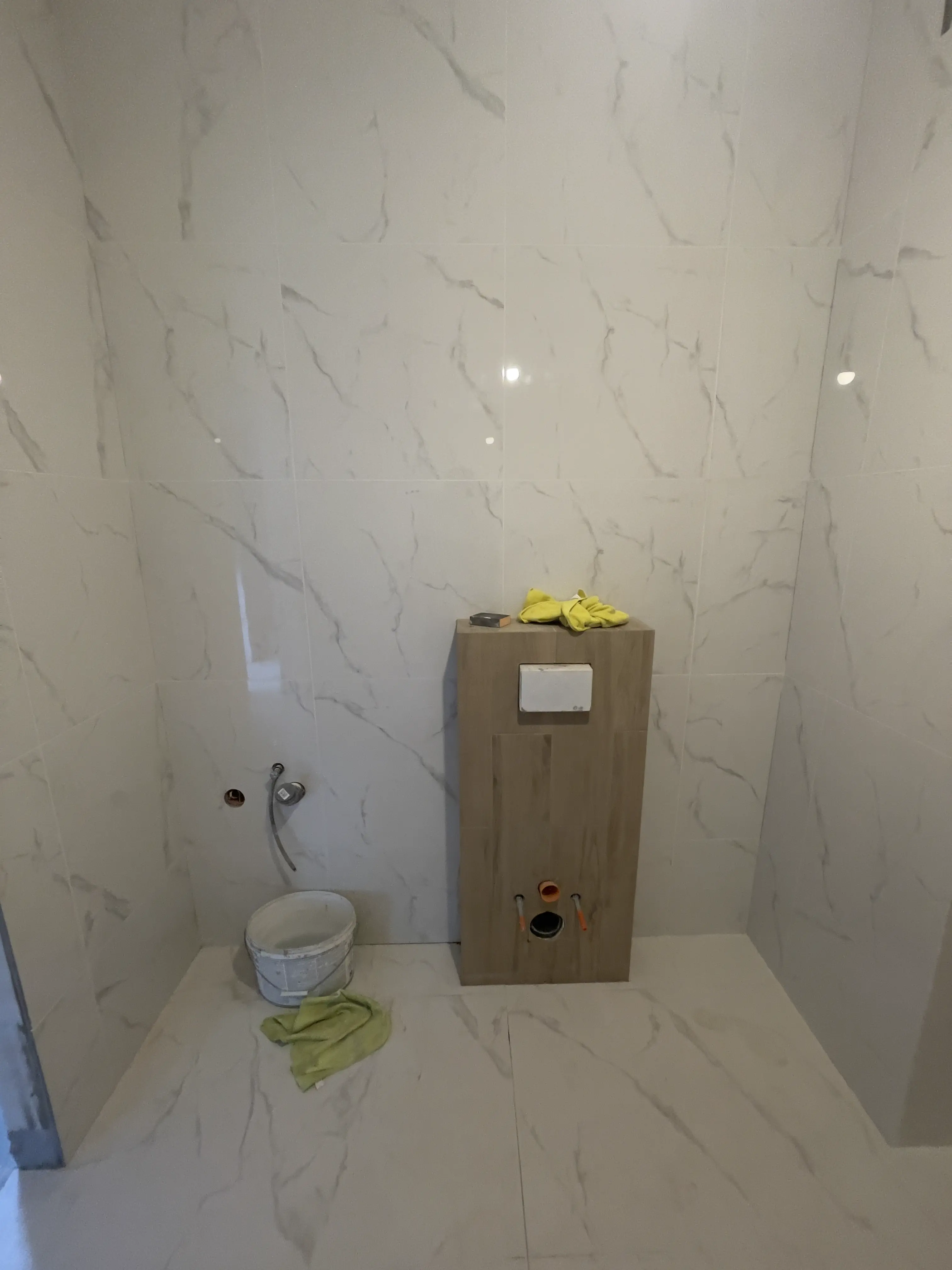 Łazienka została wykonana kompleksowo – od przygotowania podłoża i izolacji przeciwwilgociowej, przez układanie płytek, po montaż elementów wyposażenia. Szczególną uwagę zwrócono na precyzję układania płytek podłogowych oraz zachowanie odpowiednich spadków i osi.