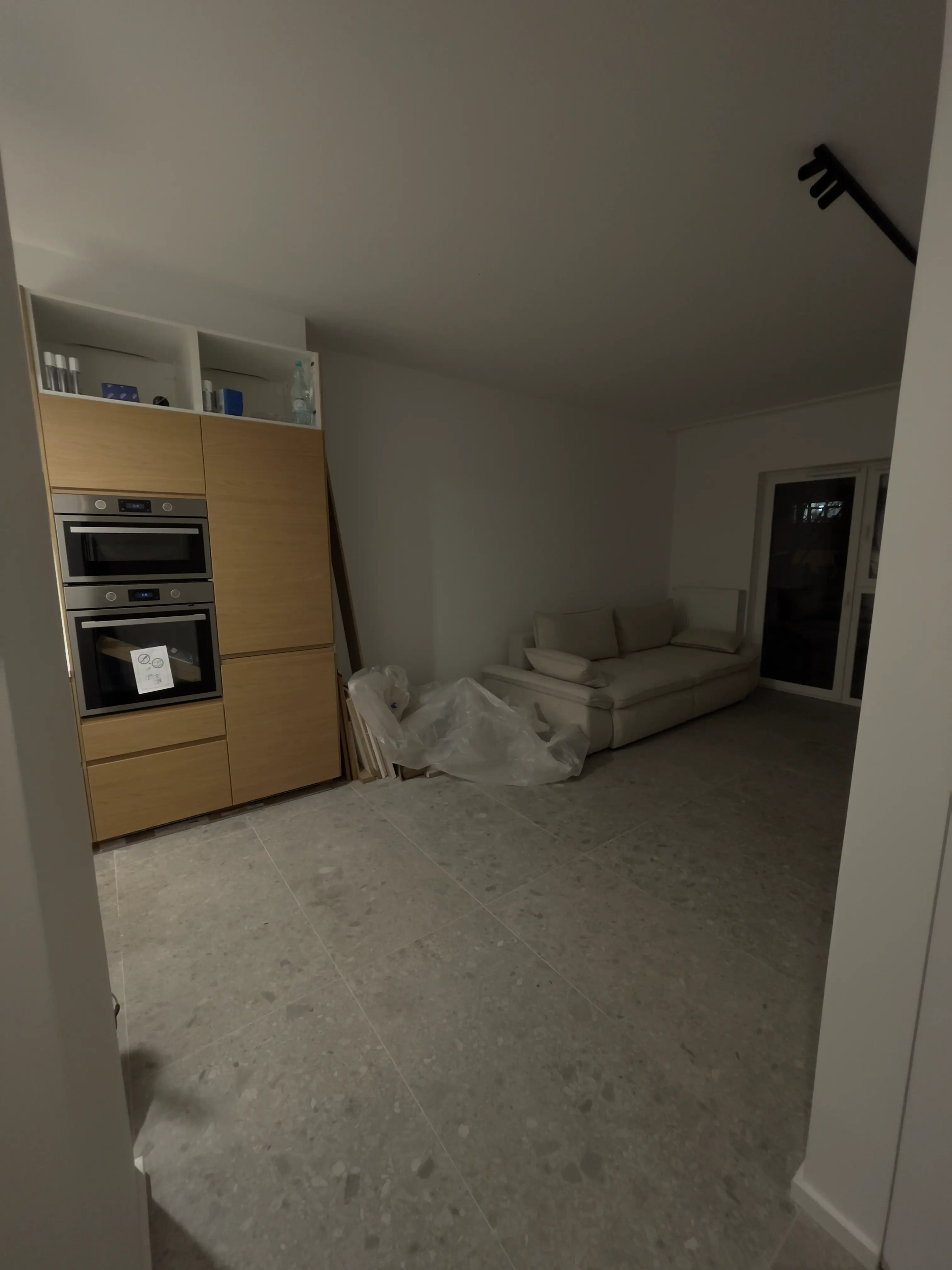 W aneksie kuchennym wykonano zabudowę GK umożliwiającą estetyczne ukrycie instalacji oraz przygotowanie przestrzeni pod zabudowę meblową. Obudowa okapu została wykonana z zachowaniem osi i proporcji względem zabudowy.