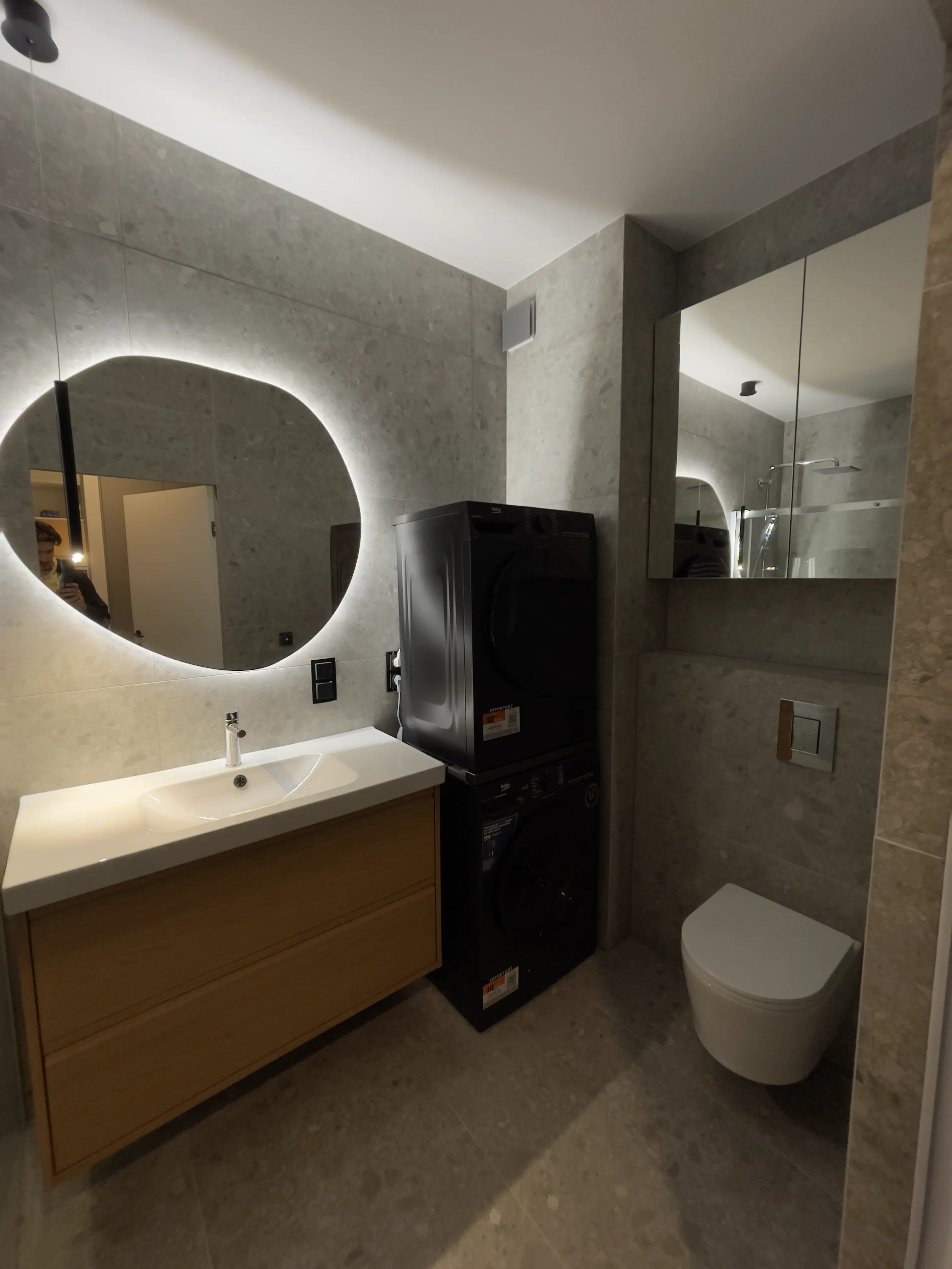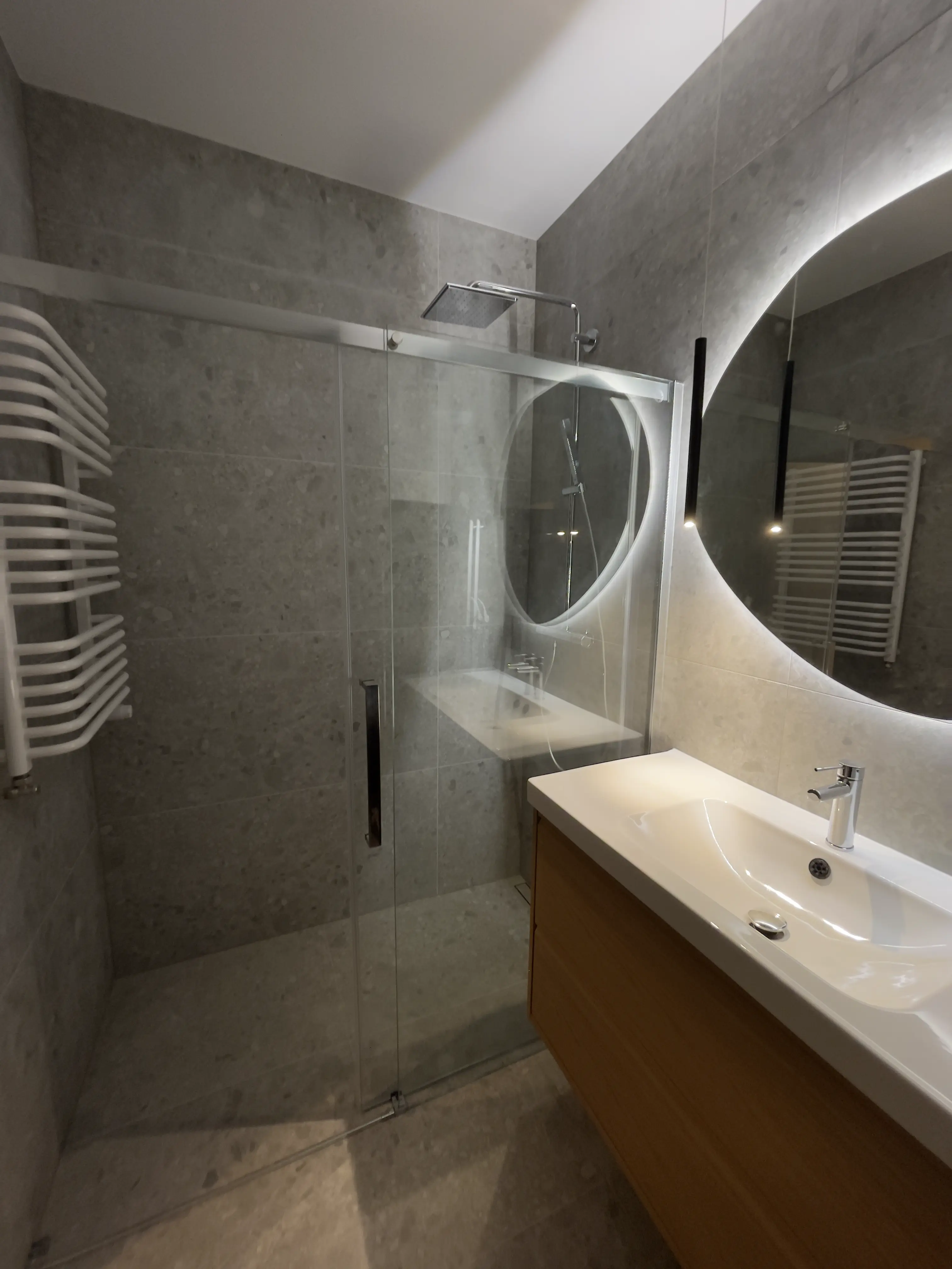 Łazienka została wykonana w standardzie pod klucz – od instalacji, przez hydroizolację, po montaż ceramiki i armatury.